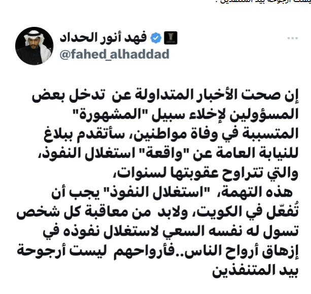بينما علق المحامي الكويتي الشهير فهد أنور الحداد كتب عبر حسابه الشخصي بـ تويتر بعد انتشار أنباء