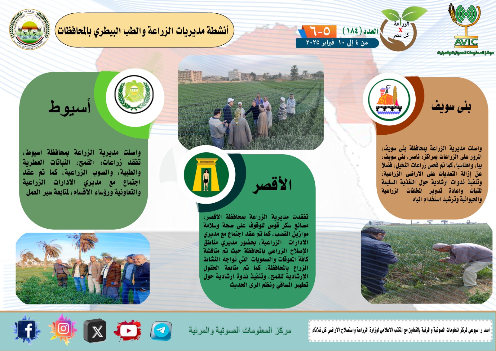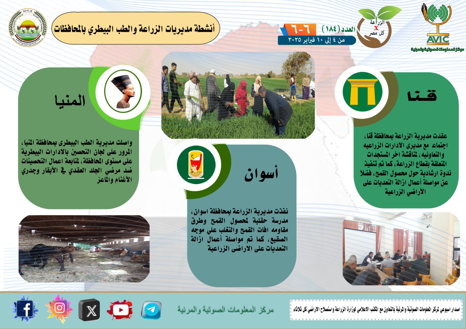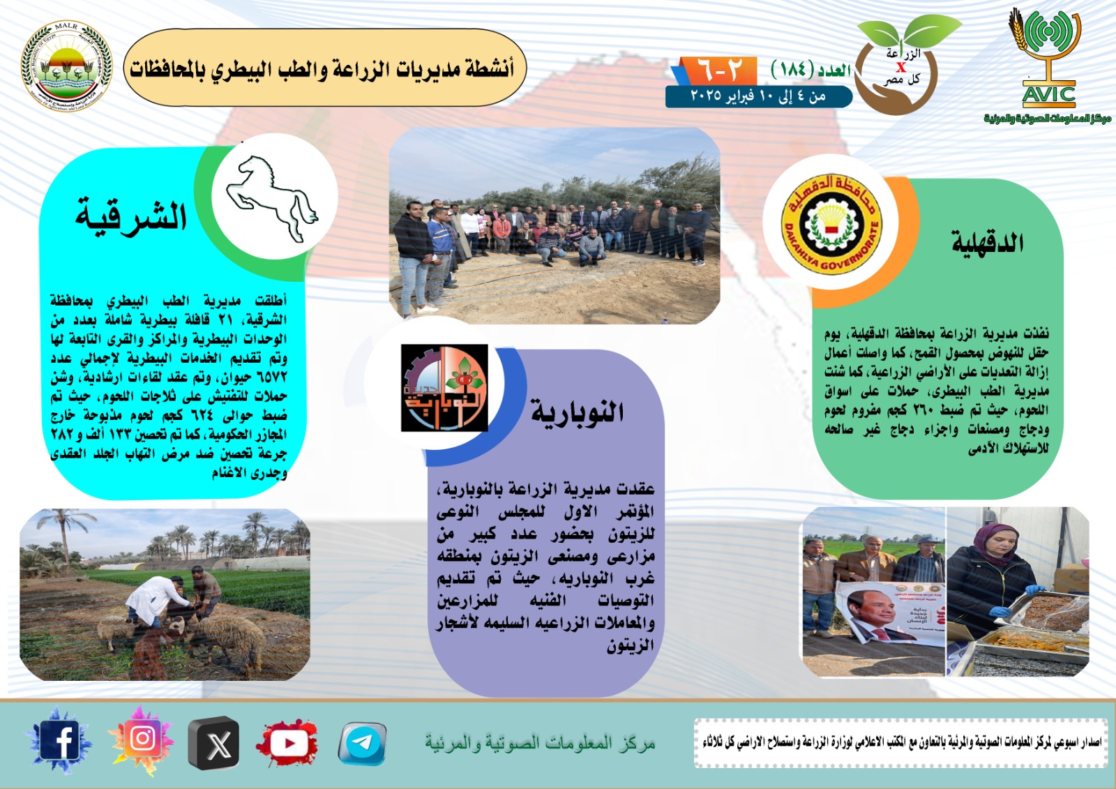 “الزراعة في كل مصر” العدد رقم 184 .. تعرف على أنشطة وجهود مديريات الزراعة والطب البيطري خلال الفترة من 4 إلى 10 فبراير الجاري