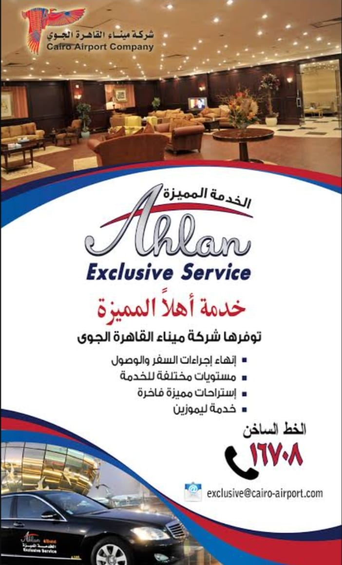ومن منطلق توفير تجربة سفر مريحة وممتعه حرصت شركة ميناء القاهرة الجوى على توفير خدمة أهلا (خدمة Vip ) والتى يتم تقديمها فى مطار القاهرة الدولى وإتاحتها للمسافرين علي متن رحلات شركات الطيران المتعددة الجنسيات علي كل درجات تذاكر الطيران،
