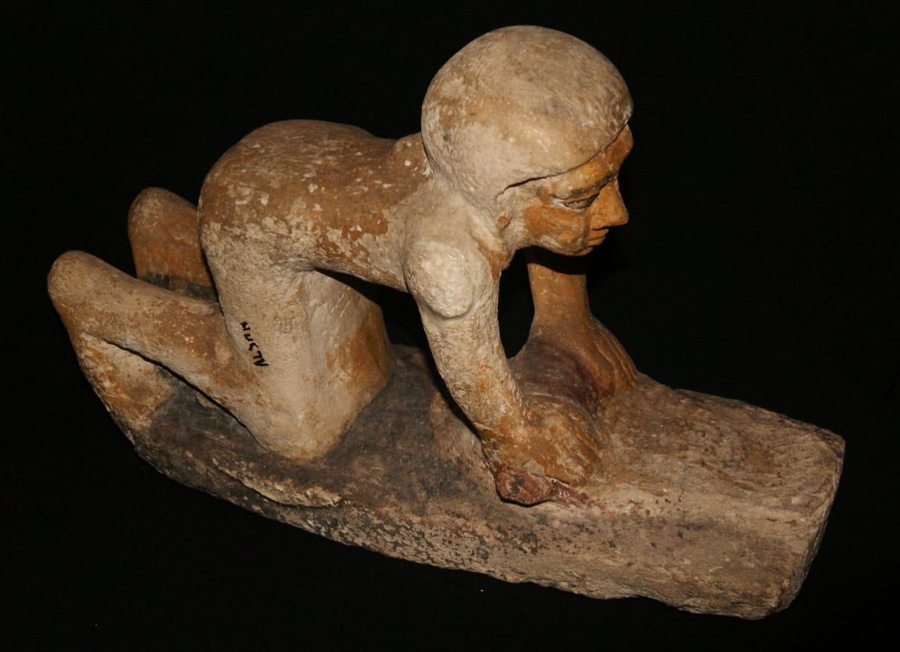 يعرض تمثال لخادمة من الحجر الجيرى تقوم بطحن الحبوب على قاعده مستطيلة