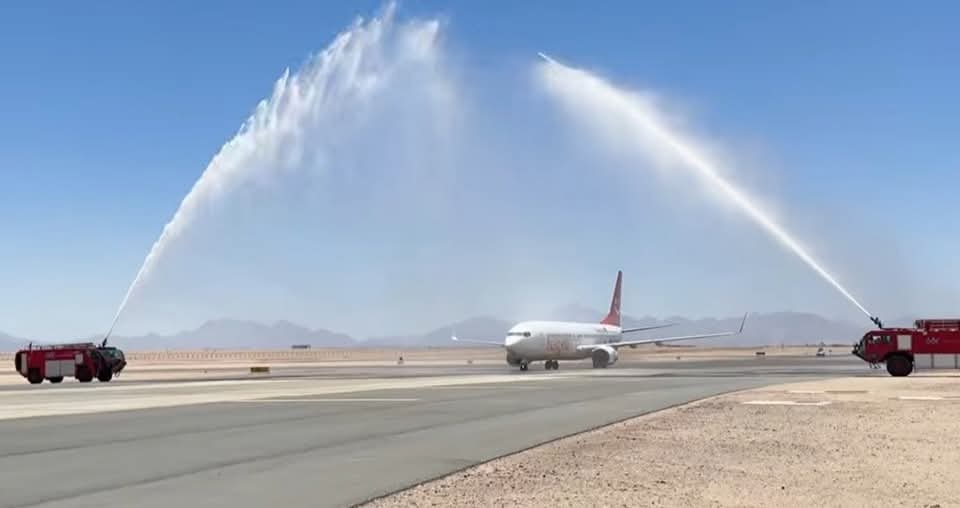 وجرى تنظيم استقبال احتفالي مميز للركاب فور وصول الطائرة، بقيادة الطيار أيمن صلاح نائب مدير المطار، وبحضور فريق العلاقات العامة والإعلام.