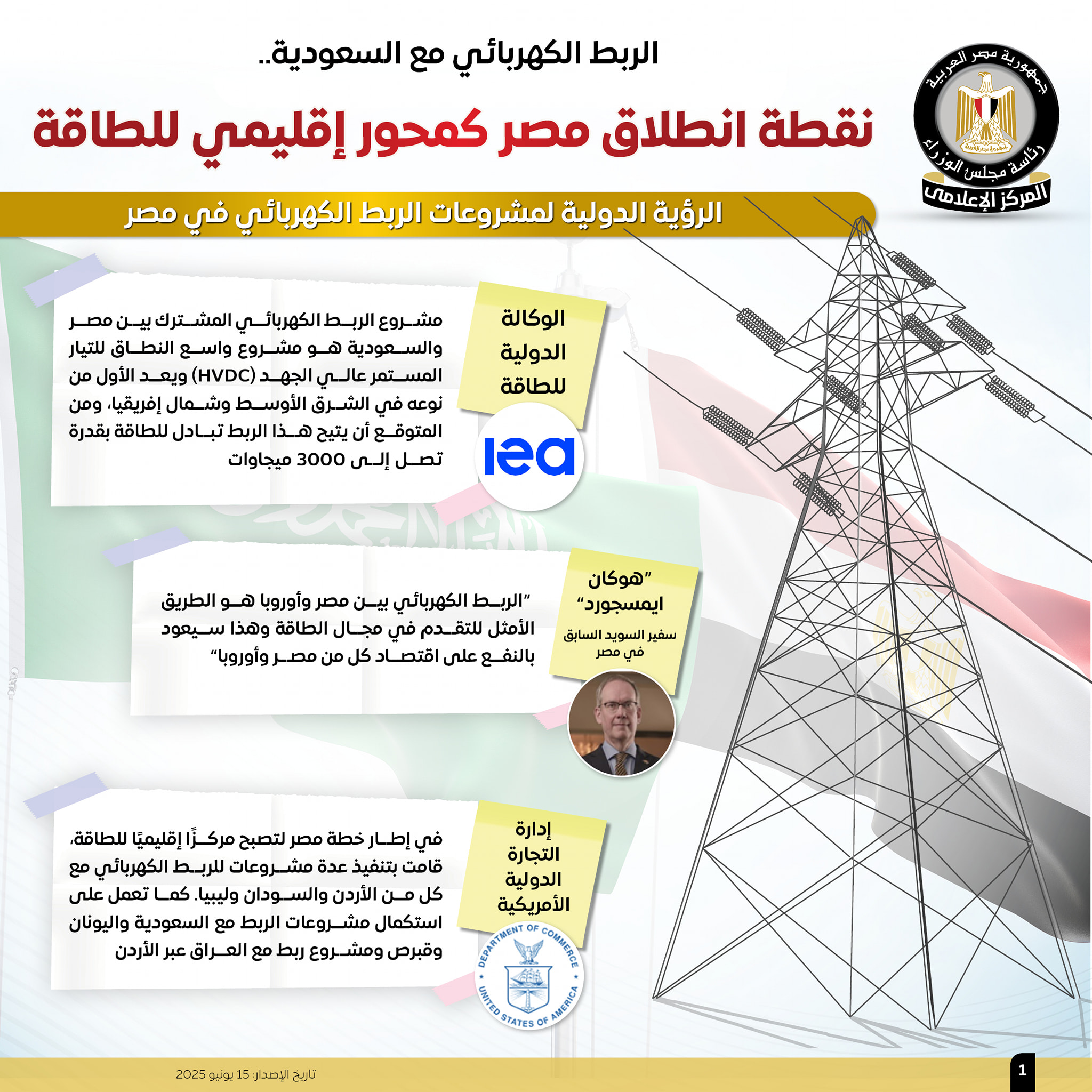المصري السعودي، الذي يمثل نقطة انطلاق استراتيجية نحو إنشاء شبكة كهرباء عربية موحدة، تدعم أمن الطاقة وتدفع عجلة التنمية في المنطقة.