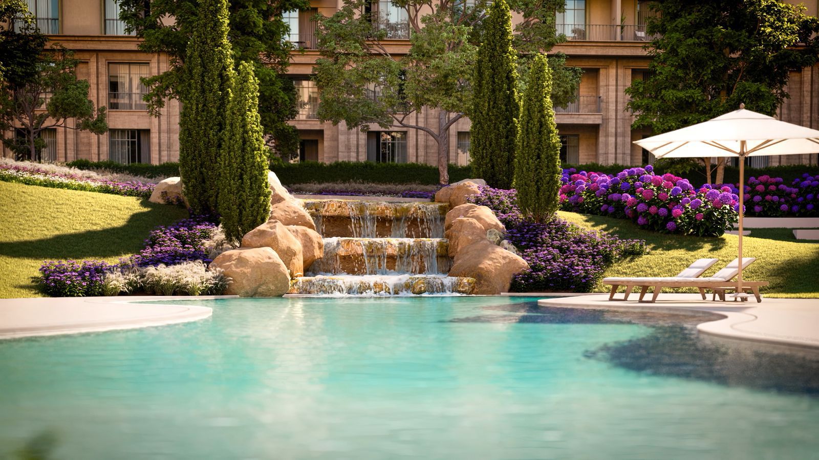 جيم، حمام سباحة، شلالات، مناطق للجلوس وسط الطبيعة، منطقة ألعاب للأطفال، منطقة تجارية، بالإضافة إلى