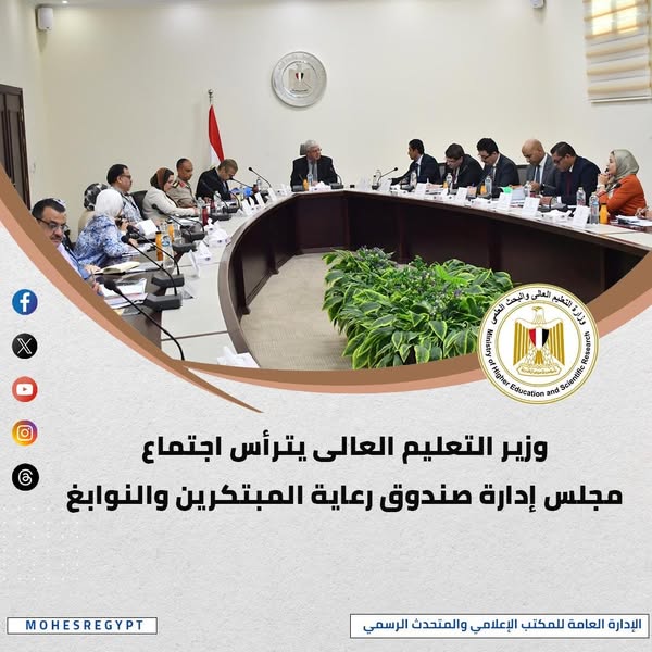 ترأس د.أيمن عاشور وزير التعليم العالي والبحث العلمي اجتماع مجلس إدارة صندوق رعاية المبتكرين والنوابغ، وخلال الاجتماع أكد الوزير أهمية مواصلة العمل لتعزيز الابتكار وريادة الأعمال، وتحويل البحث العلمي إلى منتجات تخدم الاقتصاد الوطني، في إطار الإستراتيجية الوطنية للتعليم العالي ورؤية مصر 2030،