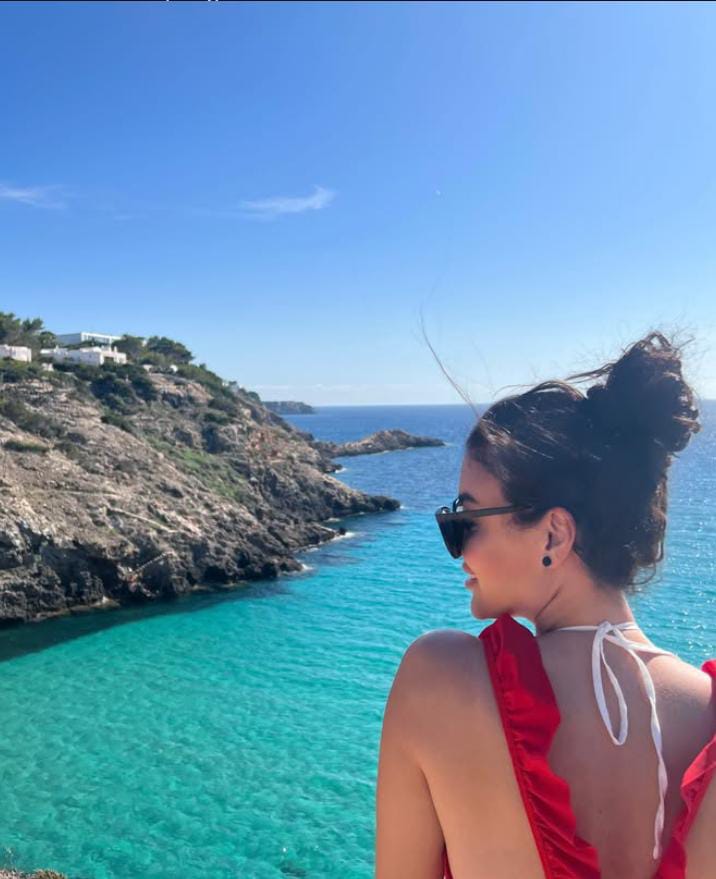 ظهرت ميرنا بفستان صيفي أبيض نقي بدون أكمام، تميّز بتفاصيل باللون الأحمر عند الكتف، مما أضفى عليه لمسة من الجرأة والنعومة في آنٍ واحد. اختيارها للفستان الأبيض يعكس إحساسًا بالانتعاش، كما يُبرز إشراقة البشرة ويتلاءم تمامًا مع أجواء البحر.