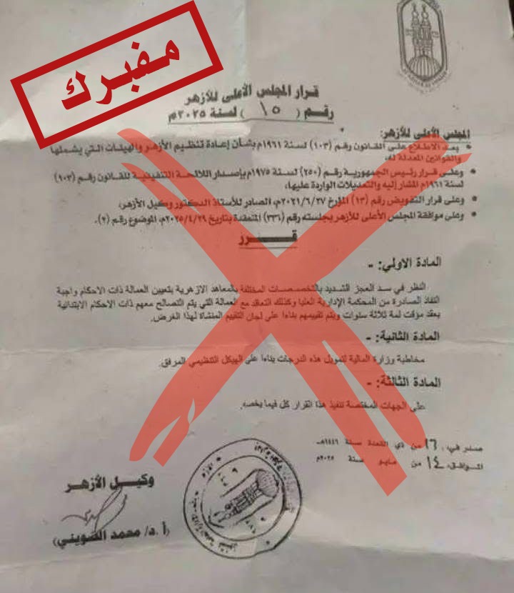 نفي المركز الإعلامي للأزهر صحة ما يتم تداوله بشأن قرارات مزعومة منسوبة إلى الأزهر، تتعلق بتعيين العمالة المتطوّعة (المنضمة) للعمل بالمعاهد التي تم إنشاؤها بالجهود الذاتية، مؤكدا أن هذه القرارات لم تصدر عن أي جهة رسمية في الأزهر، وأن ما يتم تداوله في هذا الشأن عارٍ تمامًا من الصحة، ويهدف إلى الاحتيال على المواطنين البسطاء واستغلال حاجاتهم.