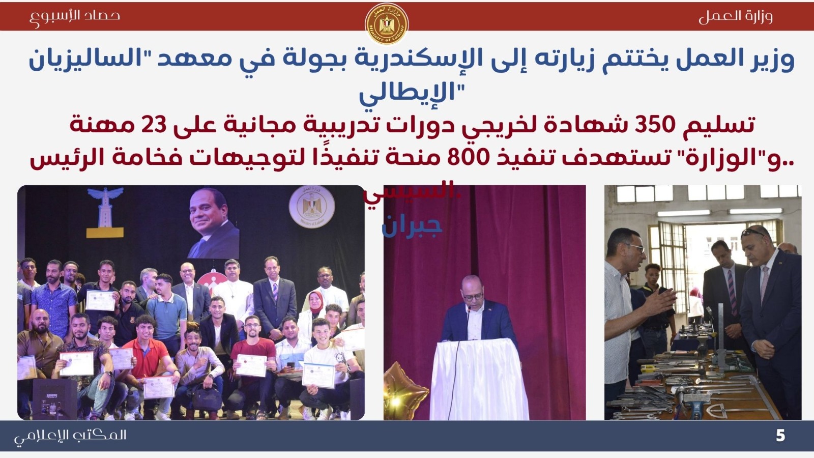 *قام السيد/ محمد جبران وزير العمل بجولة في محافظة الإسكندرية استقبله خلالها الفريق أحمد خالد حسن سعيد، محافظ الإسكندرية، بمكتبه بديوان عام المحافظة..خلال الجولة قام الوزير والمحافظ بافتتاح ندوة تثقيفية بشأن قانون العمل الجديد ،ثم افتتاح فاعليات مشروع برنامج الدخول لسوق العمل، بالتعاون مع الوكالة الالمانية للتعاون الدولى GIZ ، وتسليم جوائز لأوائل خريجي دورات تدريبية من مراكز التدريب التابعة للوزارة داخل المحافظة ، وكذلك تسليم شهادات تخرج بمعايير دولية، لخريجين جدد حصلوا على دورات تدريبية مجانية من معهد الساليزيان الايطالي “دون بوسكو ” ، فرع الإسكندرية ..