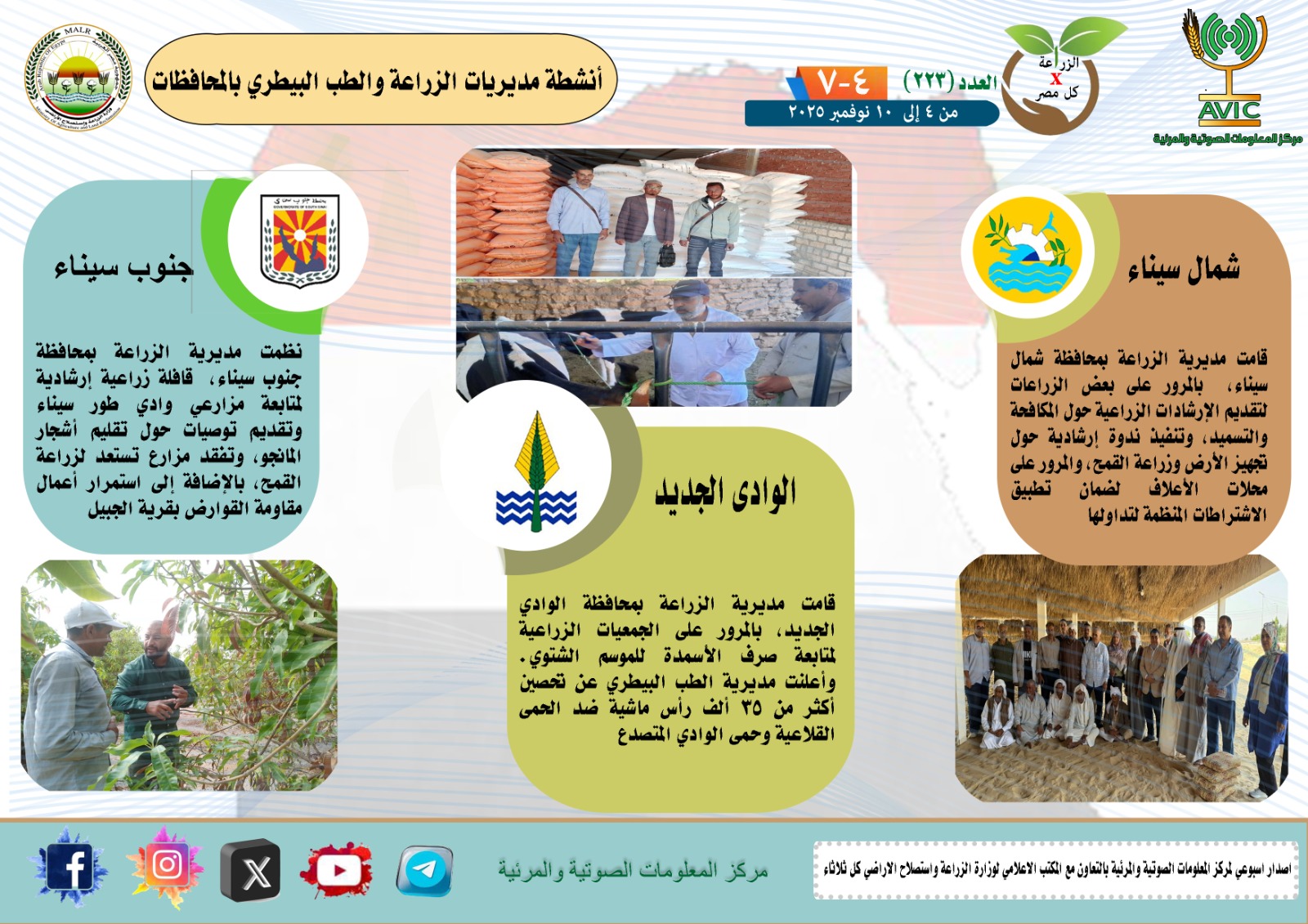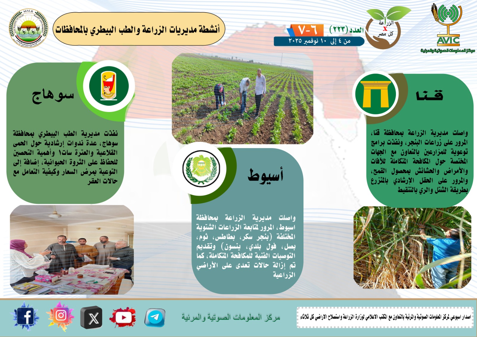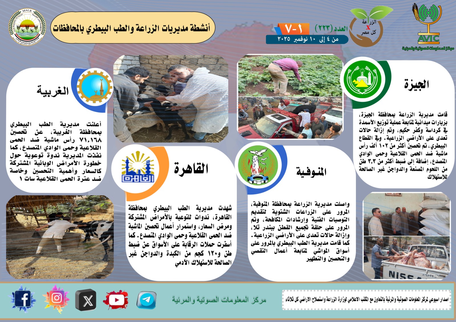 أصدر مركز المعلومات الصوتية والمرئية التابع لوزارة الزراعة واستصلاح الأراضي، والمكتب الاعلامي للوزارة، العدد رقم 223 من اصدار: “الزراعة في كل مصر” بالانفوجراف والفيديو، يوضح الجهود والانشطة التي تقوم بها مديريات الزراعة والطب البيطري بمحافظات الجمهورية خلال الفترة من 4 إلى 10 نوفمبر الجاري