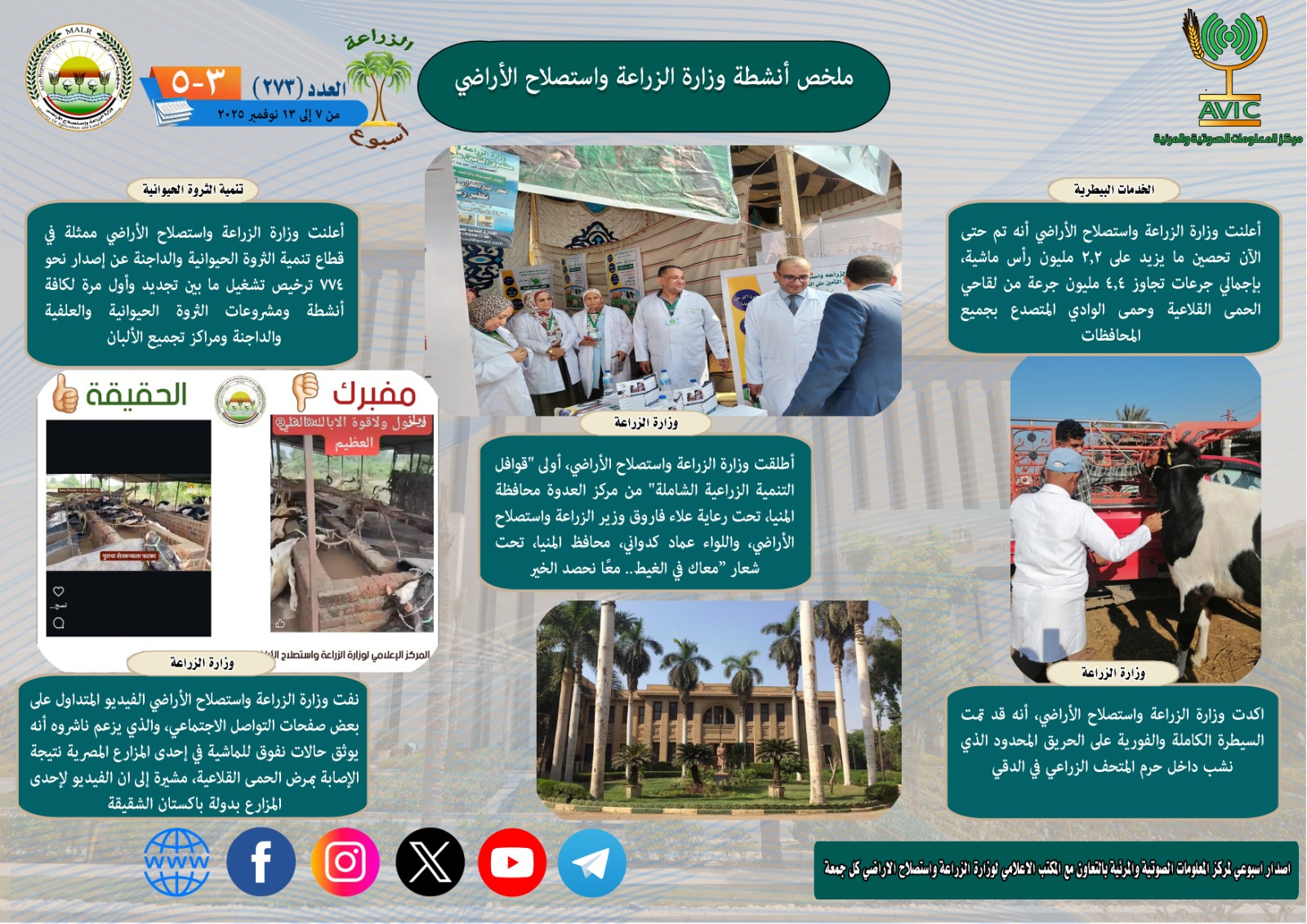 الزراعة تنشر الحصاد رقم 273 في الفترة من 7 وحتى 13 نوفمبر الجاري.. أصدر مركز المعلومات الصوتية والمرئية بوزارة الزراعة واستصلاح الأراضي، “الانفوجراف الاسبوعي” في نسخته رقم 273 حول الحصاد الاسبوعي لأهم أنشطة الوزارة، خلال الاسبوع الماضي في الفترة من 7 وحتى 13 نوفمبر الجاري، كما أصدر المركز ايضا ملخصا بالفيديو، حول انشطة الوزارة خلال نفس الفترة.