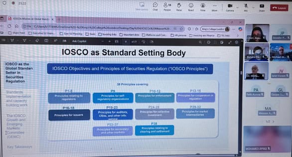 وتناول الدكتور فريد الدور الذي تلعبه (IOSCO) منذ تأسيسها، بوصفها المظلة الدولية التي تضم جهات رقابية تشرف على أكثر من 95% من أسواق الأوراق المالية حول العالم.