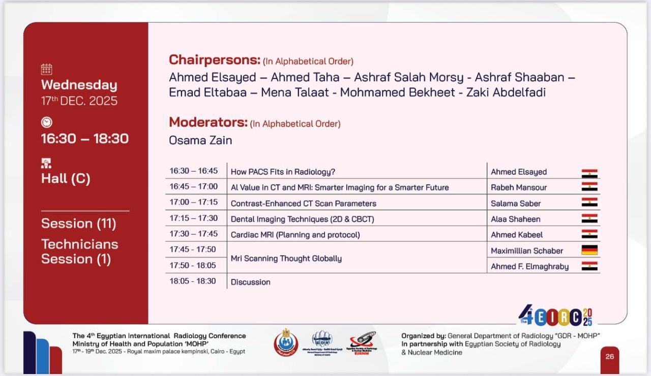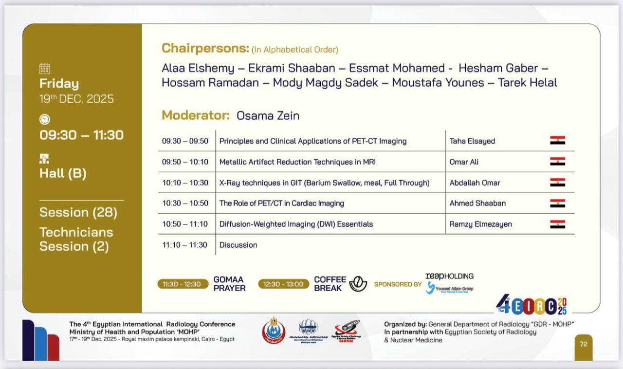 8- عمر علي، أخصائي تقنيات التصوير بالأشعة، مستشفى الشرطة بأسيوط، ويعرض “تقنيات وكيفية تحسين جودة الصورة وإصلاحها”، وذلك في حال وجود معادن داخل الجسم، خاصة في صور الرنين المغناطيسي.
