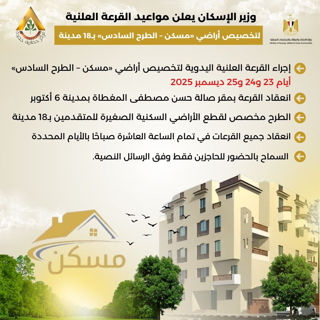 إجراء القرعة أيام 23 و24 و25 ديسمبر بمدينة 6 أكتوبر