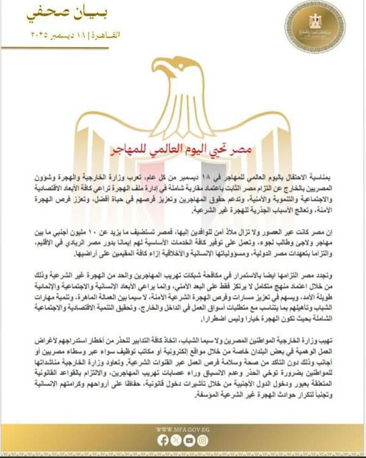 بمناسبة الاحتفال باليوم العالمي للمهاجر تعرب وزارة الخارجية والهجرة وشؤون المصريين بالخارج عن التزام مصر الثابت باعتماد