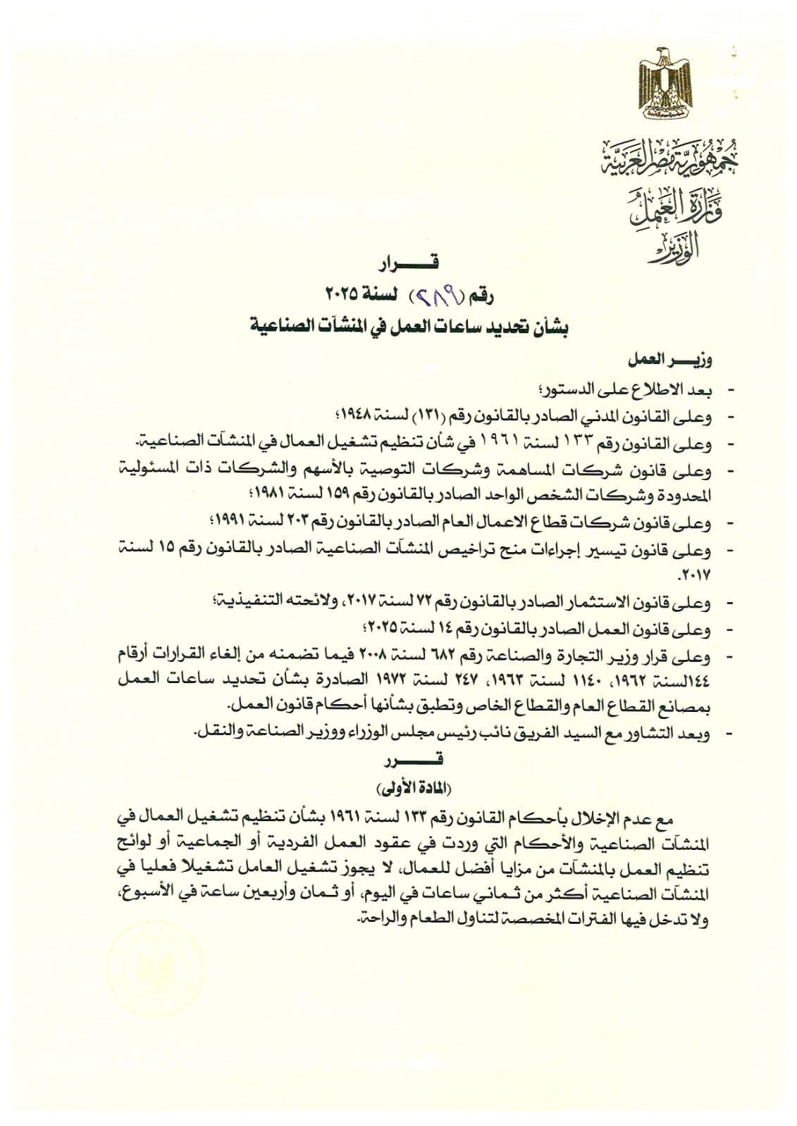 وزير العمل يصدر القرار الوزاري رقم 289 لسنة 2025 لتحديد ساعات العمل بالمنشآت الصناعية