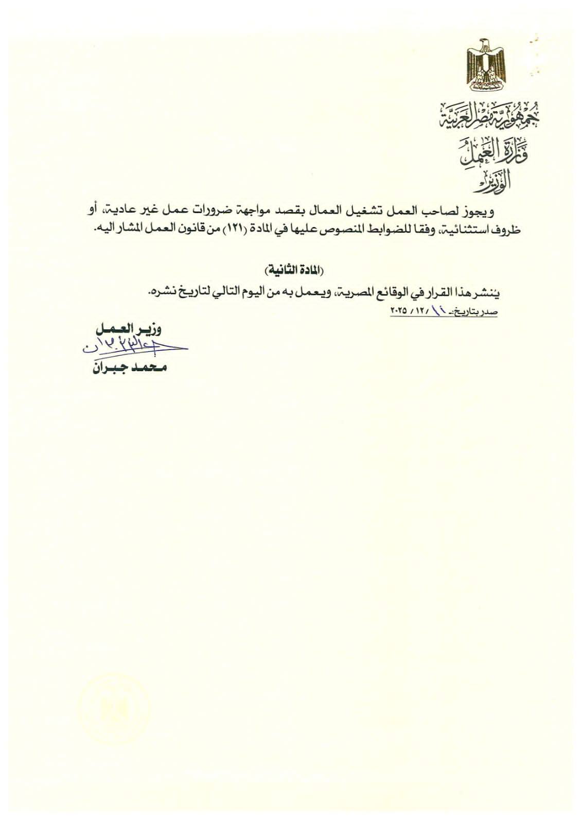 كما يسمح القرار لصاحب العمل بتشغيل العمال لساعات إضافية فقط في حالات الضرورة أو الظروف