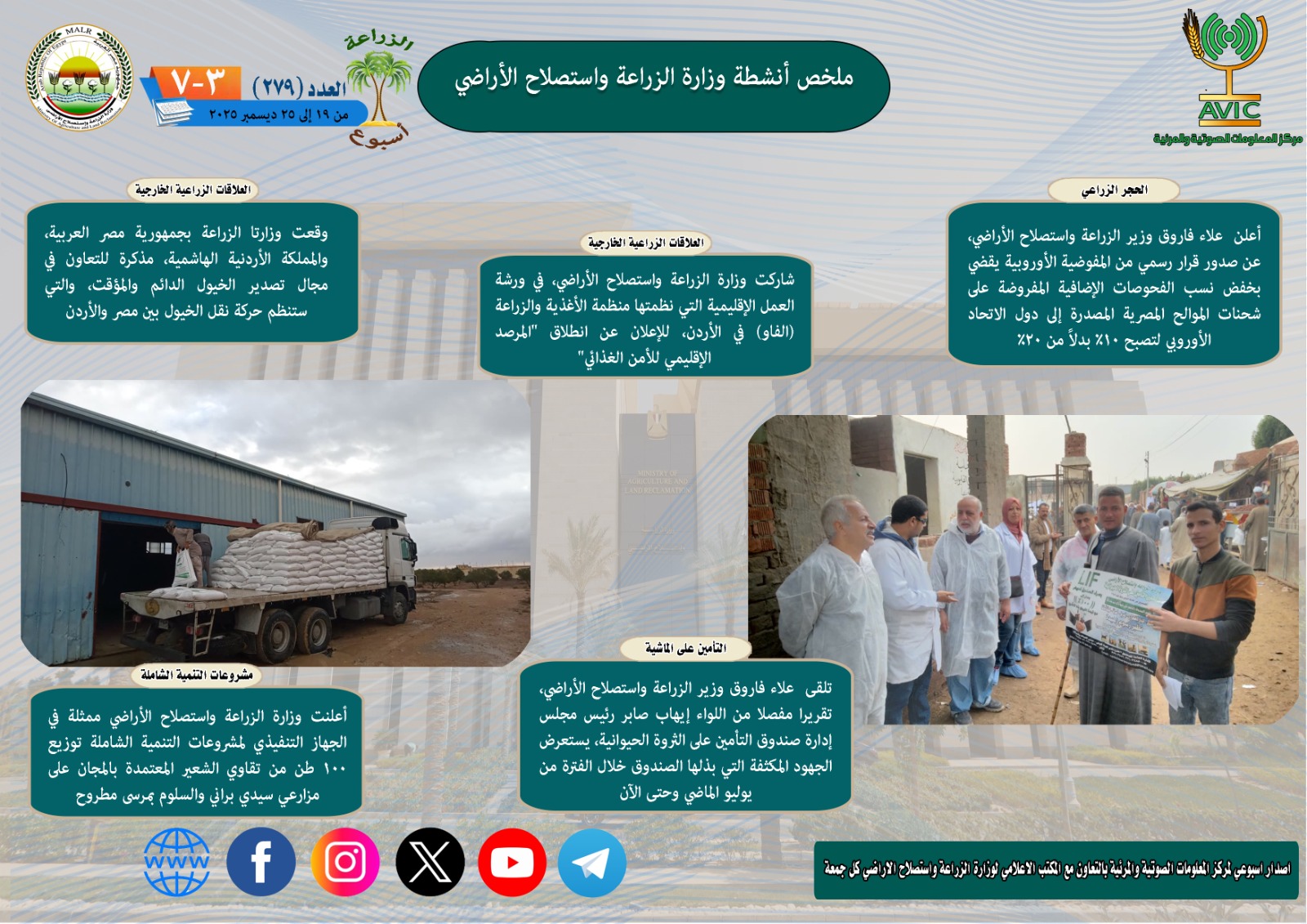 أصدر مركز المعلومات الصوتية والمرئية بوزارة الزراعة واستصلاح الأراضي، “الانفوجراف الاسبوعي” في نسخته رقم 279 حول الحصاد الاسبوعي لأهم أنشطة الوزارة، خلال الاسبوع الماضي في الفترة من 19 وحتى 25 ديسمبر الجاري، كما أصدر المركز ايضا ملخصا بالفيديو، حول انشطة الوزارة خلال نفس الفترة.