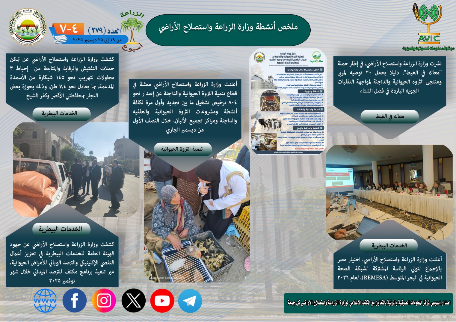 وأعلنت وزارة الزراعة واستصلاح الأراضي، اختيار مصر بالإجماع لتولي الرئاسة المشتركة لشبكة الصحة الحيوانية في البحر المتوسط (REMESA)، لعام 2026، كما كشفت الهيئة العامة للخدمات البيطرية في تعزيز أعمال التقصي الإكلينيكي والترصد الوبائي للأمراض الحيوانية،