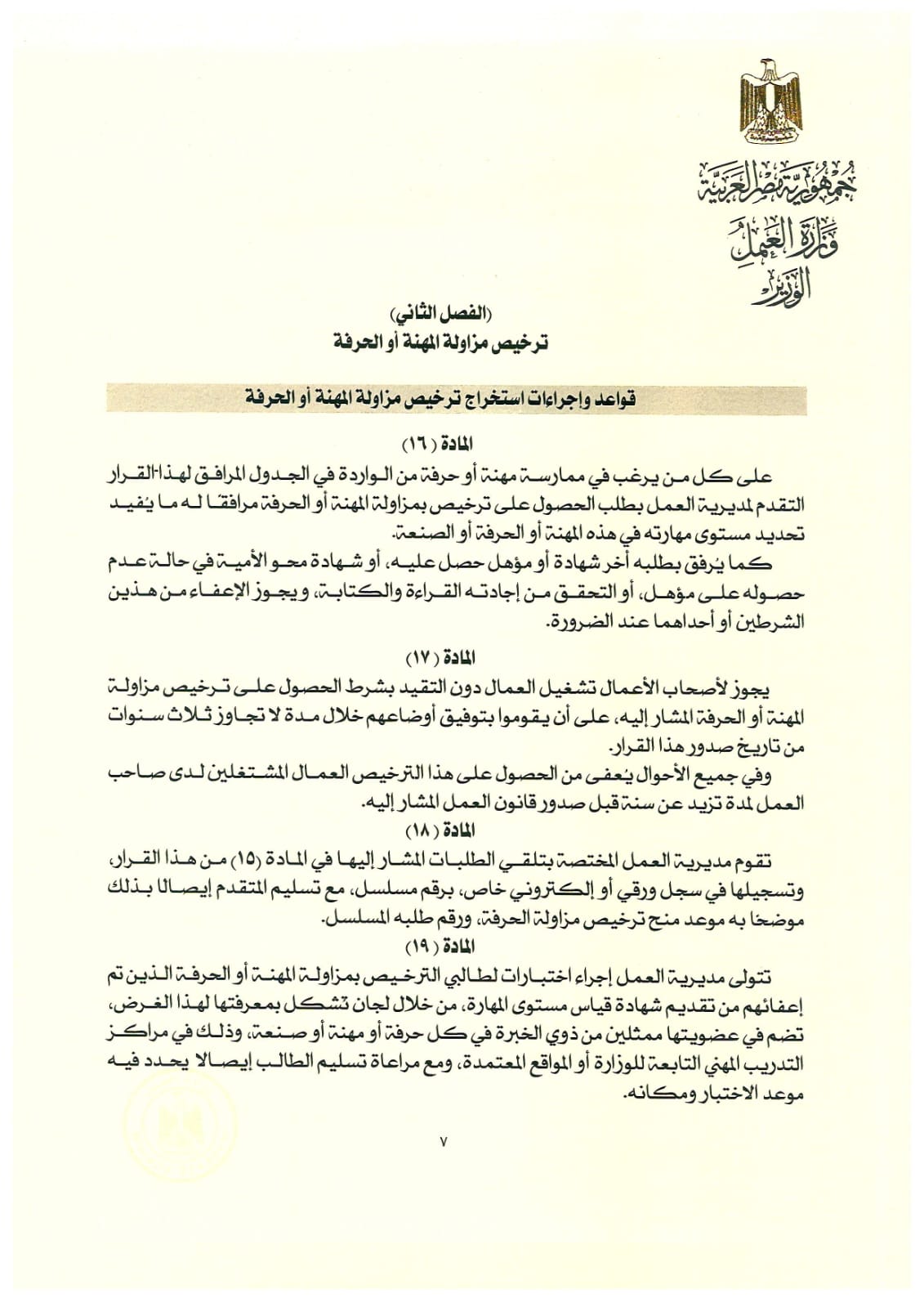 إعفاء العاملين في المهنة لمدة تزيد عن سنة قبل صدور القرار، وأصحاب الأعمال لديهم مهلة ثلاث سنوات لتوفيق أوضاعهم.