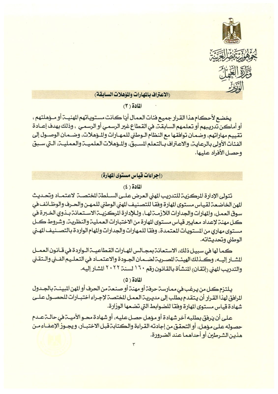 لقانون العمل الجديد رقم 14 لسنة 2025. ويأتي القرار في إطار تعزيز نظام وطني للمهارات، ورفع كفاءة
