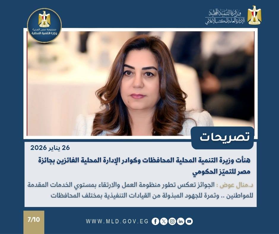 وهنأت الدكتورة منال عوض وزيرة التنمية المحلية والقائم بأعمال وزير البيئة، المحافظات والكوادر المحلية الفائزة بجائزة مصر للتميز الحكومي في دورتها الرابعة والتى تم الإعلان عنها فى الاحتفالية التى أقامتها وزارة التخطيط والتنمية الاقتصادية تحت رعاية الرئيس عبد الفتاح السيسي، وبحضور الدكتور مصطفى مدبولى رئيس مجلس الوزراء وعدد كبير من الوزراء والمحافظين، وسفير دولة الإمارات العربية المتحدة لدى القاهرة، بالإضافة إلى عدد من السفراء، ورؤساء الهيئات الإعلامية، ورؤساء الجامعات المصرية، وعدد من المسئولين الإماراتيين.
