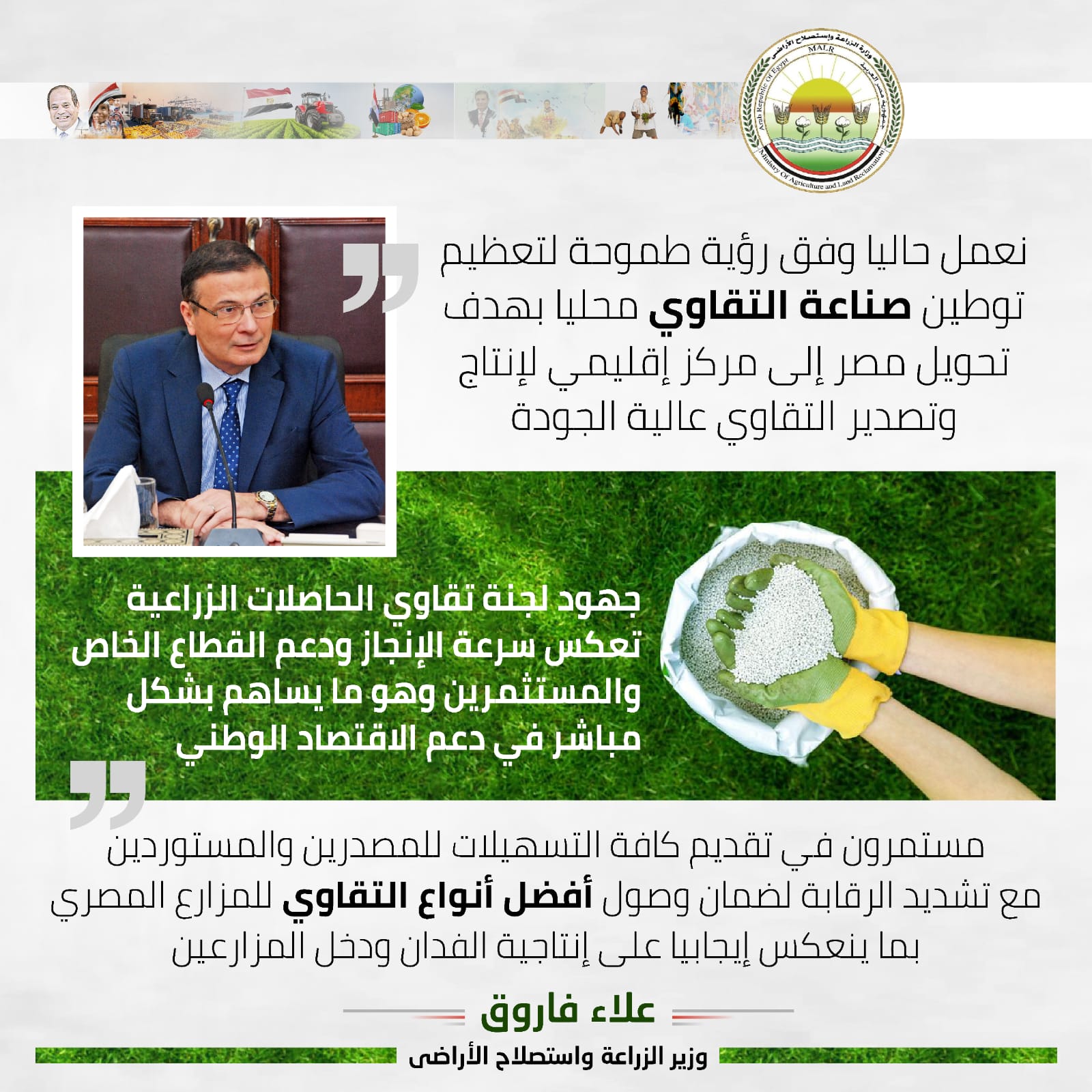 للمصدرين والمستوردين، مع تشديد الرقابة لضمان وصول أفضل أنواع التقاوي إلى المزارع المصرية،