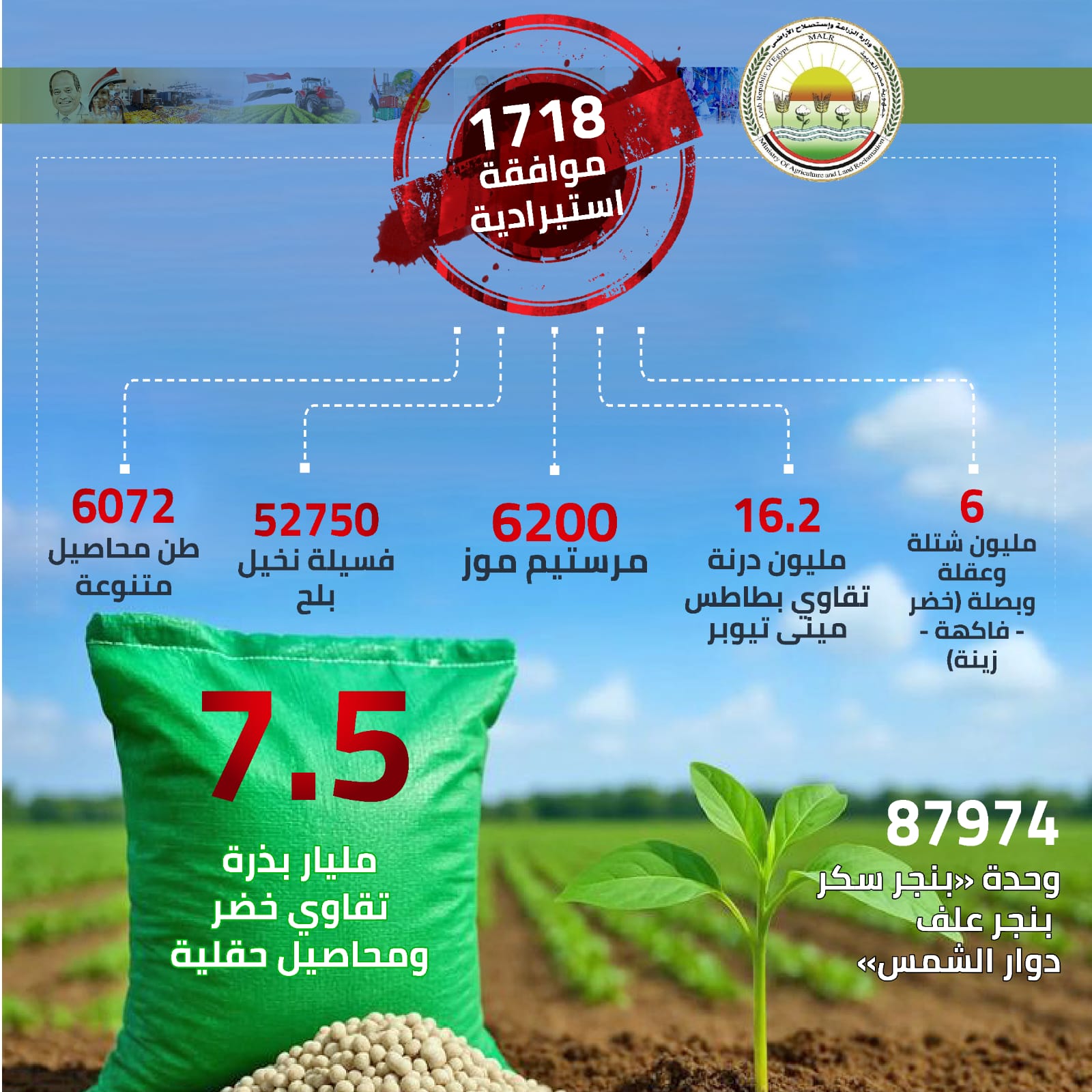 و29.6 مليون شتلة وعقل فاكهة ونباتات زينة، و410 مرستيم نخيل بلح.