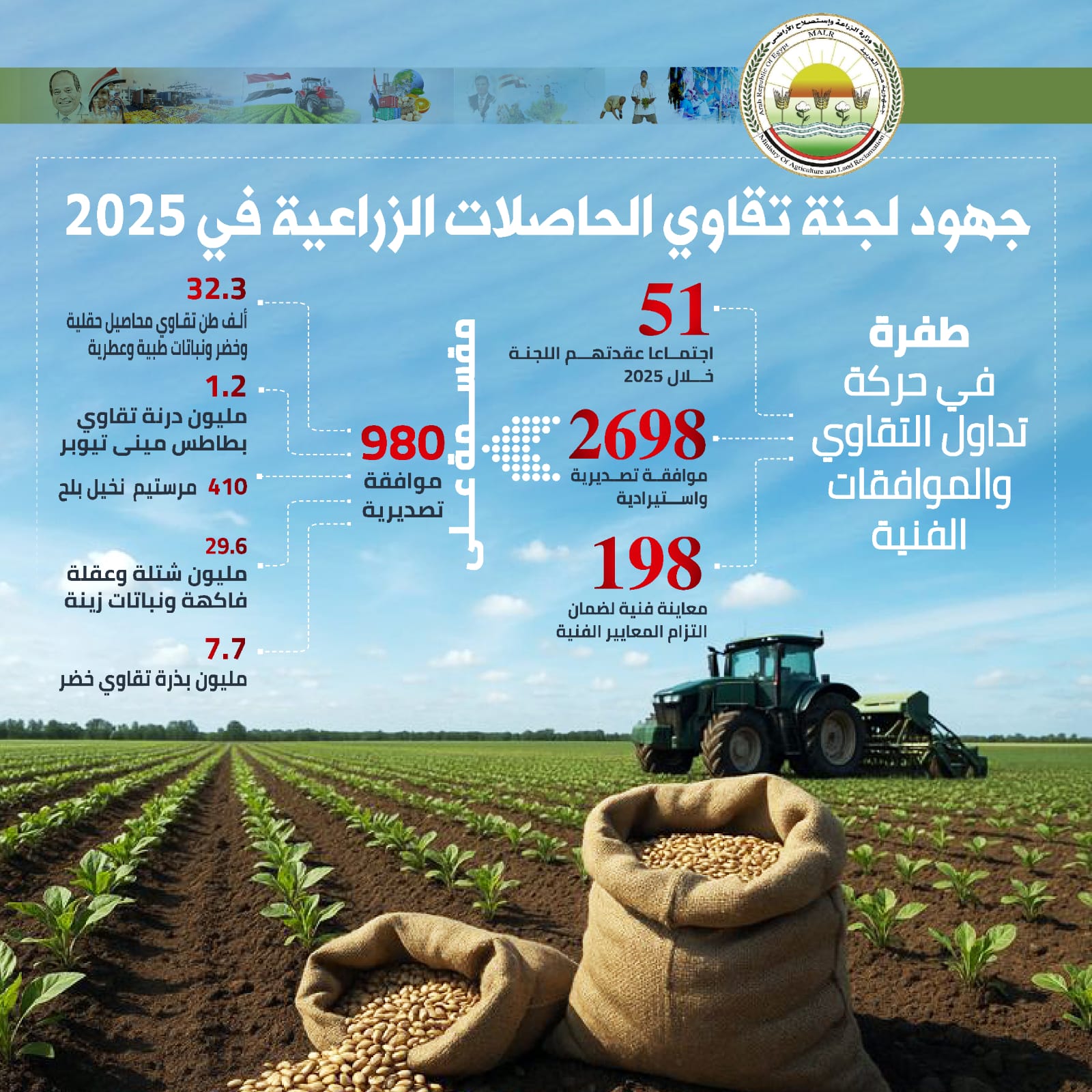32.3 ألف طن من تقاوي المحاصيل الحقلية والخضر والنباتات الطبية والعطرية والفاكهة،