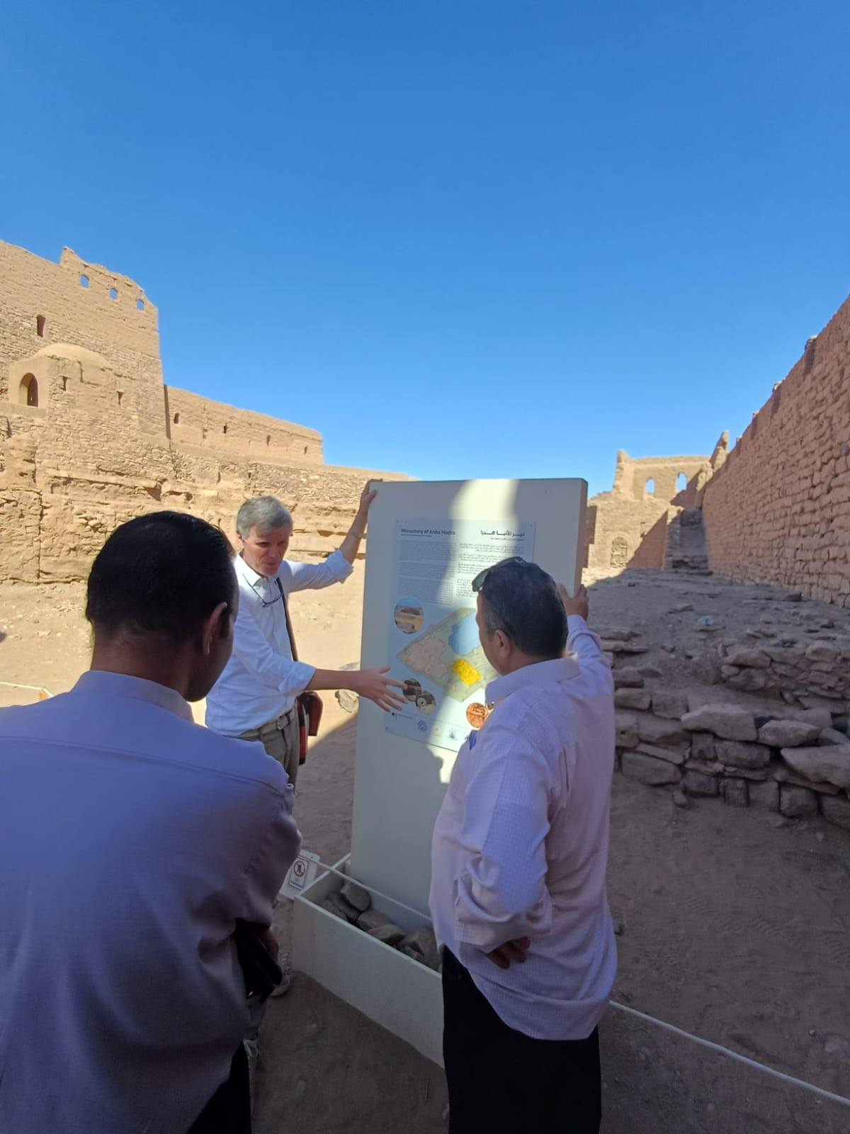 واطلع على أعمال البعثة الألمانية التابعة للمعهد الألماني للآثار، والتي بدأت منذ عام 2013 في توثيق النقوش القبطية والعربية على الجدران، وتوثيق العناصر المعمارية بالدير، وما زالت مستمرة في العمل بالموقع.