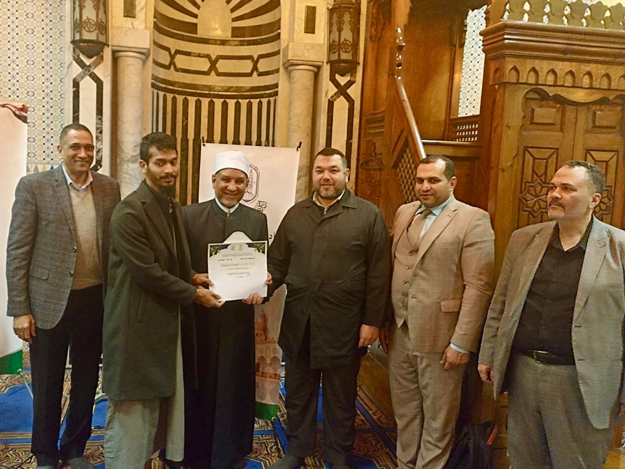 وقام فضيلته بتوزيع شهادات إتمام الدورة على المشاركين، الذين عبروا عن تقديرهم للمحتوى العلمي المتنوع، الذي شمل محاضرات في علوم القرآن الكريم، والحديث الشريف، والفقه وأصوله، ومقاصد الشريعة، إضافة إلى حلقات نقاشية وورش عمل عملية لتعزيز مهارات التحليل والتطبيق العملي للمعارف الشرعية في الخطاب الدعوي.