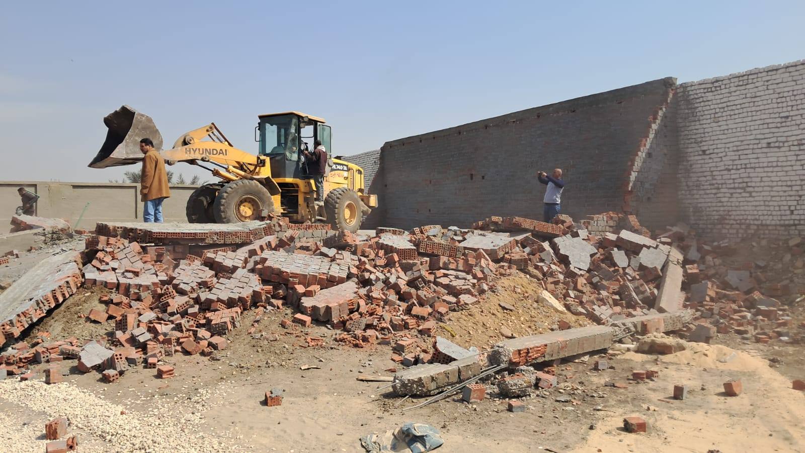 في أعمال بناء بالطوب والأسمنت بالقرب من المعهد الديني بقرية بهرمس، وكذلك إزالة حوائط بالطوب