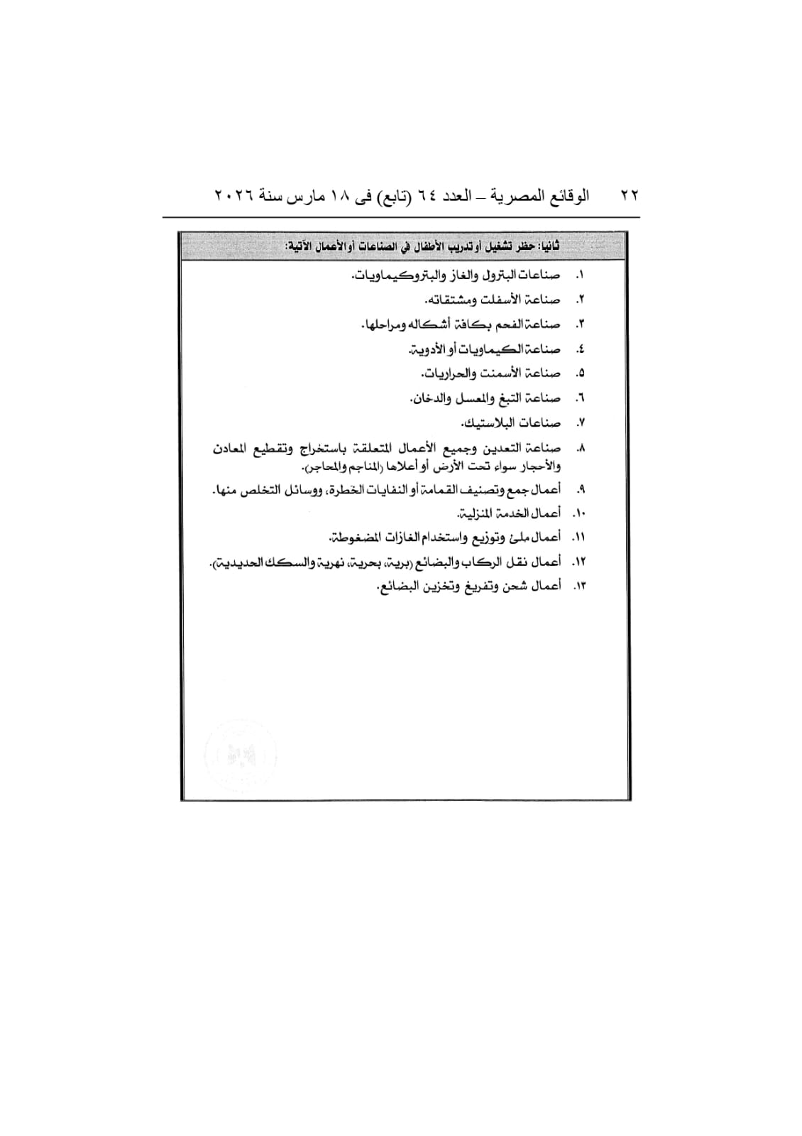وتضمن القرار قوائم تفصيلية بالمهن الخطرة التي يُحظر تشغيل الأطفال بها نهائيًا، حفاظًا على سلامتهم الجسدية والنفسية، ومن بينها العمل في المناجم والمحاجر، وبعض الأعمال في صناعة الأسفلت والمنسوجات،والتعامل مع المواد الكيماوية أو النفايات الخطرة.. كما حدد القرار الأوزان والحمولات المسموح للأطفال بحملها بما يتناسب مع قدراتهم البدنية، بما يضمن توفير بيئة عمل آمنة.