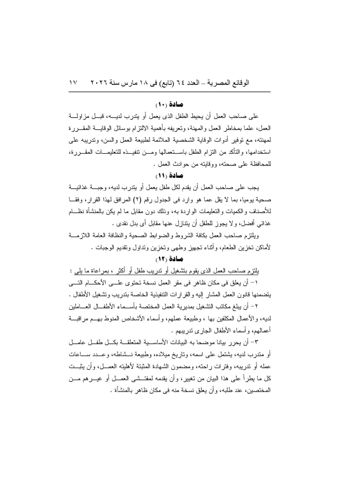 كما حدد القرار ساعات عمل الأطفال – المسموح لهم بالعمل – بما لا يتجاوز 6 ساعات يوميًا، مع منع تشغيلهم لساعات إضافية أو تكليفهم بالعمل خلال أيام الراحة الأسبوعية والعطلات الرسمية، إلى جانب حظر تشغيلهم ليلاً في الفترة من السابعة مساءً حتى السابعة صباحًا.