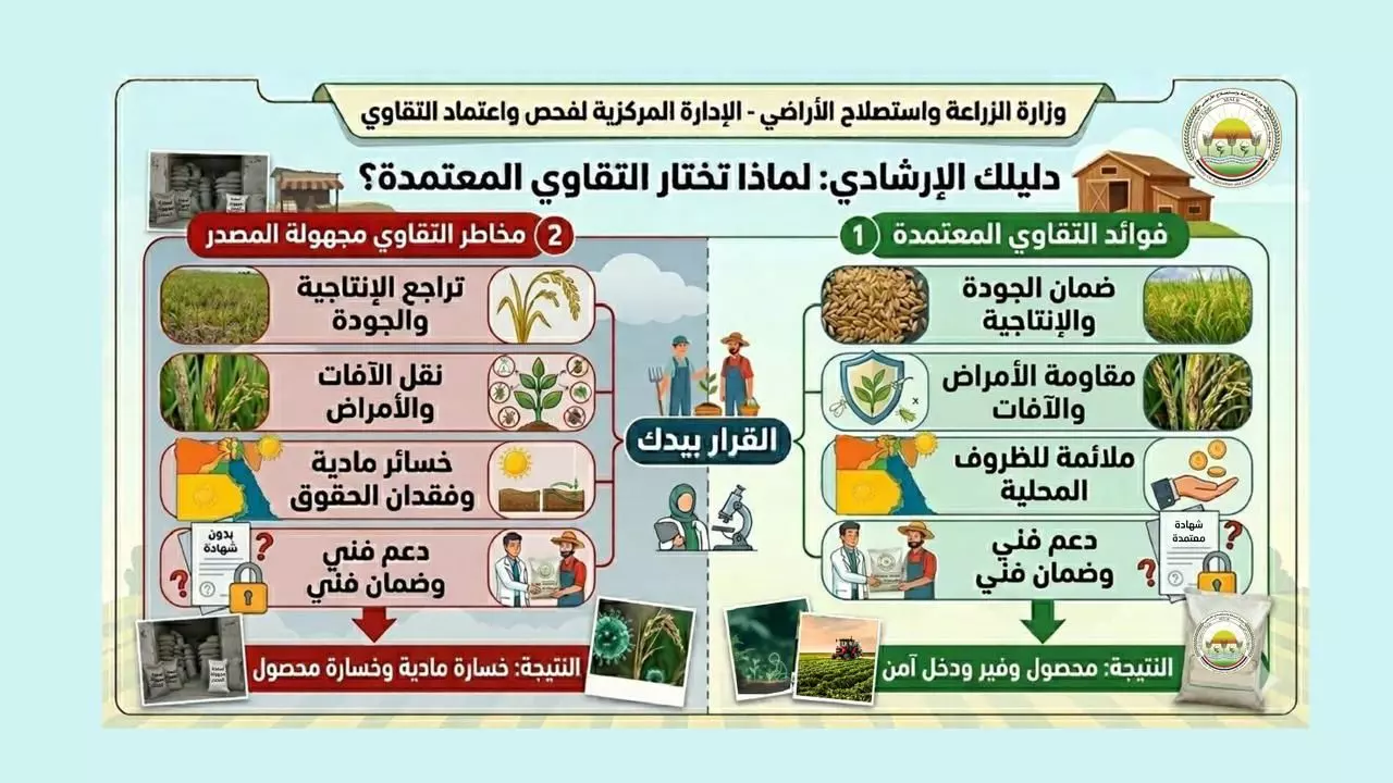 - اتباع دليل الإدارة المركزية لفحص واعتماد التقاوي لتجنب الأضرار المالية والإنتاجية