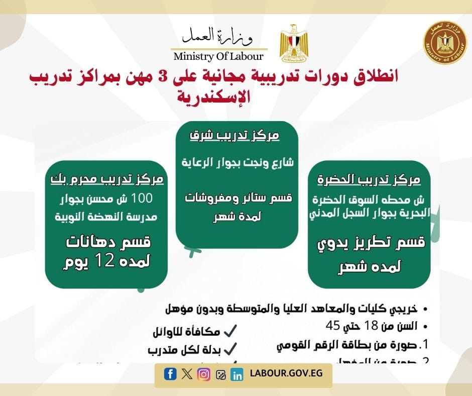 أعلن عبد الونيس عبد الله، وكيل مديرية العمل بالإسكندرية، عن إطلاق 3 دورات تدريبية مجانية