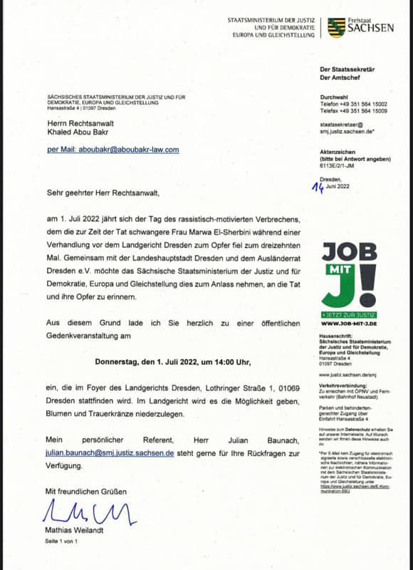 وزارة العدل الالمانية تدعو المحامي الدولي خالد ابوبكر لإحياء ذكري مقتل مروة الشربيني